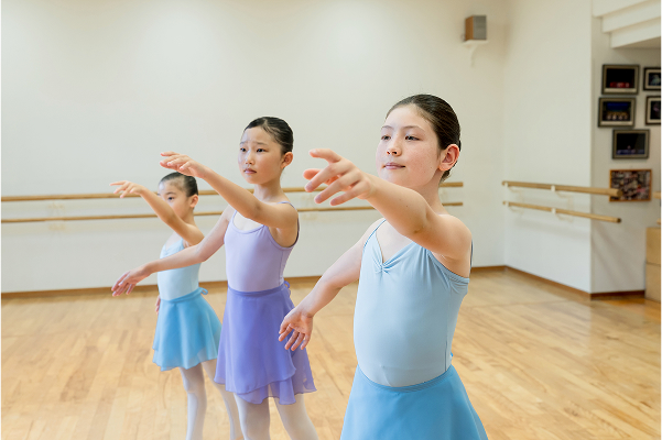 体のバランスの練習の助けとなるバーを使って、バレエの基礎を順を追って講師と一緒に練習します。